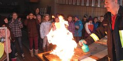 Das Highlight war die Station von Dieter Friedrich zum Thema „Brennen und Löschen“. Hier gab es kleine Stichflammen, das Rauchhaus mit Rauchmelder oder eine brennende Wunderkerze in Wasser zu bestaunen.