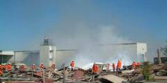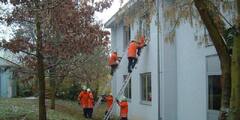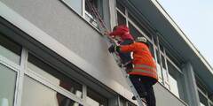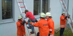 Der erste Einsatzwagen trifft ein und hält an der Nordseite der Schule. Schnell sind die Steckleitern an die Fenster gestellt. Die Wehrmänner bringen eine Klasse sicher auf den Boden. Auch auf der Südseite des Gebäudes laden die Floriansjünger das Arbeitsgerät aus dem Einsatzwagen. Während zwei Männer mit Atemschutzgerät ins Gebäude gehen, bauen die anderen die Rettungsleiter und die Wasserversorgung auf. Der betroffene Raum liegt in fast sieben Metern Höhe. Jedes der Kinder muss deshalb vor der Rettung angeseilt werden - ein enormer Zeitaufwand. Oben, im Klassenzimmer der 3a, stehen die Jungen und Mädchen in der Rettungsschlange . Und so manchem Kind wird ganz schön mulmig, als es den Schritt aus dem Fenster machen muss.
