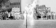 „Ihr wisst sicher alle, wie Pommes Frites hergestellt werden. Kennt ihr aber auch die Gefahren im Umgang mit heißem Fett?“, regte Beck die Neugier der Kinder an. Auf der Grünfläche beim Pausenhof hatten die Blauröcke eine Vorrichtung aufgebaut, die einem Gartengrill ähnlich sah. Mit einem Gasbrenner erhitzte Andreas Beck einen halben Liter Fett bis über den Siedepunkt hinaus. Sein Kollege Felix Winterholer zog an einem Seil und ein kleiner Becher Wasser ergoss sich in das Fett. Die Explosionsflamme erreichte fast die Höhe des Schulgebäudes. „Mensch, war des toll“, entfuhr es den Zuschauern. Beck wiederholte das kleine Flammeninferno nochmals mit dem gleichen Effekt.