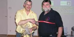 Als kleines „Dankeschön“ für die eindrucksvolle Präsentation und den Bemühungen von Dirk Schulze (links) das schwierige Thema jugendgerecht darzustellen überreichte ihm Jugendfeuerwehrwart Bernhard Brückner (rechts) zum Abschluss einen Geschenkkorb.