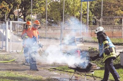 Bild: Dunst von Rauch und Löschwasser: Im Rahmen des Degmarner Jubiläums zeigte die Jugendfeuerwehr ihr Können. Foto: Ute Plückthun