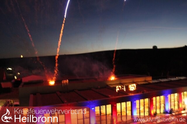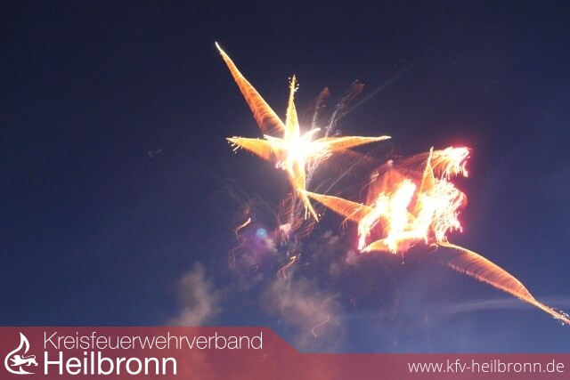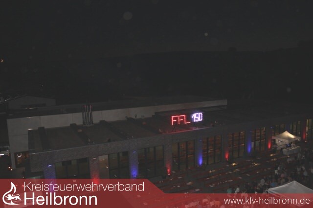 Abschlussfeuerwerk krönt Feuerwehrjubiläum Dicht gedrängt stehen die Besucher am 23. Juli auf dem schön geschmückten Festgelände der Feuerwehr Lauffen und es kommen immer noch mehr dazu, die das Abschlussfeuerwerk sehen wollen. Pünktlich um 22:20 Uhr blicken die Feuerwehrleute und Festbesucher nach einem ersten Schuss gespannt in den Himmel. Vom Dach der Feuerwehr erstrahlt das Logo FFL 150 und schon geht es los. Von den Mitarbeitern der Firma Zink in Cleebronn akribisch vorbereitet, ergießt sich mit musikalischer Begleitung ein wahrer Feuerregen vom Dach des Feuerwehrhauses und erhellt unter großem Beifall der Zuschauer den Nachthimmel. Der eine oder andere Feuerwehrkamerad muss sich in diesen emotionalen Minuten eine Träne verdrücken und man kann sichtlich die Erleichterung spüren, dass alles geklappt hat.