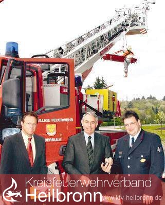 Im Rahmen einer kleinen Feierstunde im Obersulmer Feuerwehrmagazin mit zahlreichen Gästen aus den benachbarten Wehren, aus Gemeinderat und Verwaltung, übergab der Bürgermeister die Fahrzeugschlüssel an Kommandant Reiner Frisch. ?Diese Beschaffung ist nicht nur wichtig, sondern richtig für unsere Feuerwehr?, sagte Harry Murso. Er ist davon überzeugt, dass sich die Drehleiter besonders in den alten engen Ortslagen Obersulms bewähren wird.