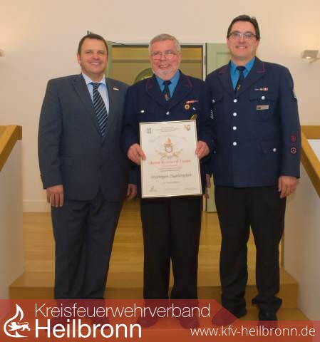 Bild 3: OB Klaus Holaschke, Ehrenstdtkommandant Reinhard Frank, der für 50 jahre Mitgliedschaft ber Feuerwehr Eppingen geehrt wurde, Abt. Kdt. Martin Kuhmann (Martin Kuhmann)