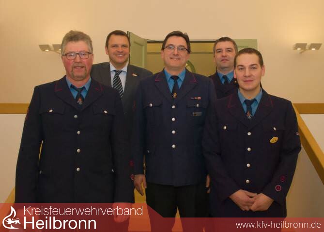 Bild 1: von links nach rechts Neues Kommando der Abt. Eppingen, ehemaliger Stellv. Kdt. Bernd Lachowitzer, OB Klaus Holaschke, Abt. Kdt. Martin Kuhmann, 2.stellv. Kdt. Frank Pitz, 1.stellv. Kdt. Thomas Blösch