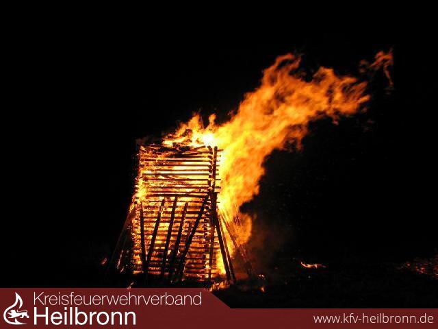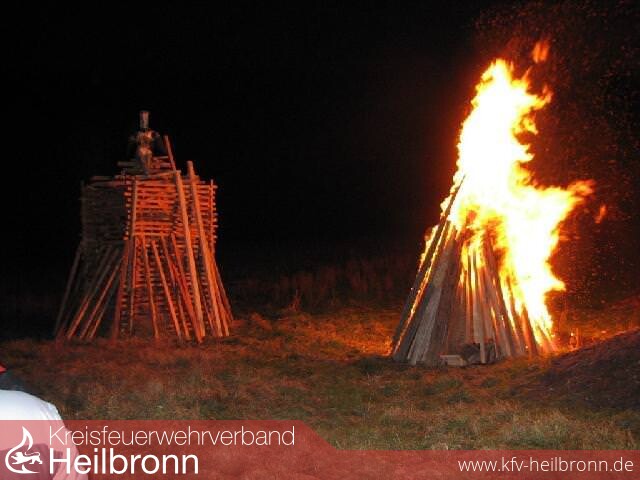 Nachdem der erste Stapel niedergebrannt war, machte sich Oberbrandmeister Markus Zeyer mit seinen Kameraden daran, den auf fast 4 Meter aufgeschichteten, zweiten Hauptstapel zu entzünden. Der auf dem Stapel thronenden Puppe wurde es relativ schnell sehr warm unterm Hintern. Der Kreis der Anwesenden wurde sprichwörtlich immer größer, da die Wärmeentwicklung um diesen Riesenstapel auch immer stärker wurde.