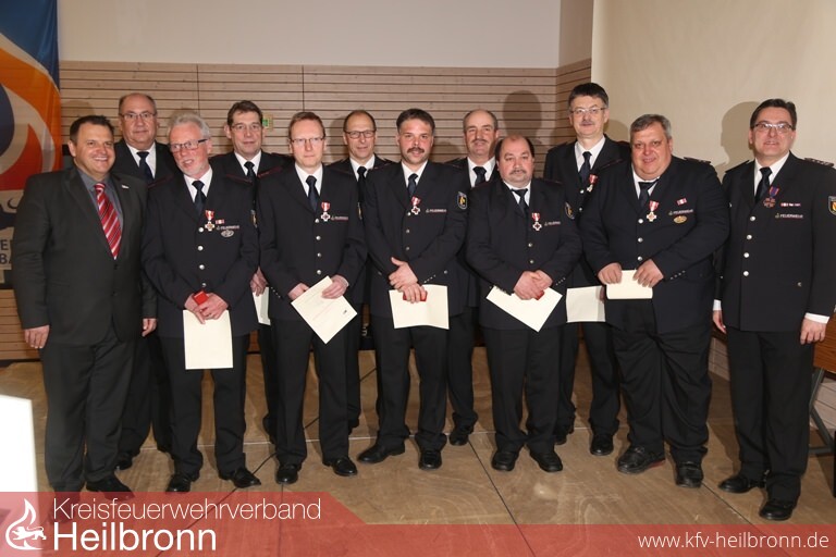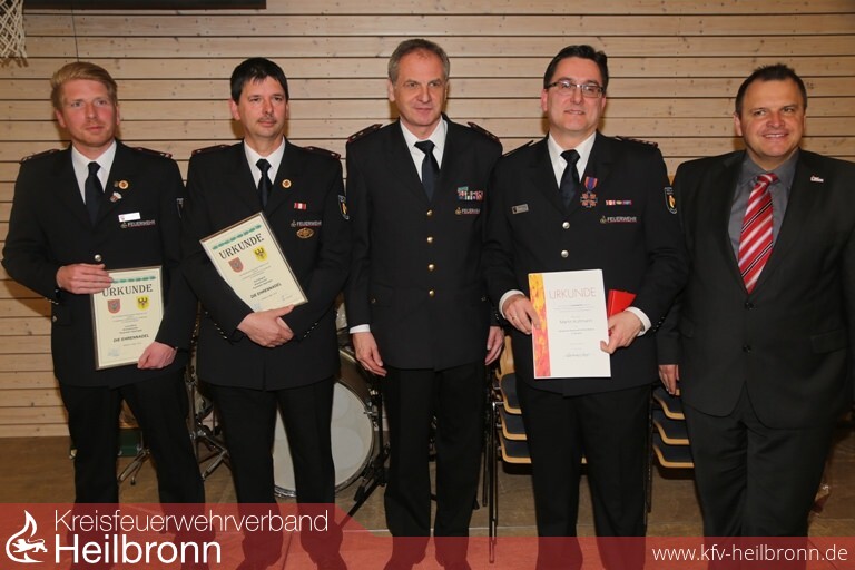Nach dem Bericht des Kommandanten konnten durch den Vorsitzenden des Kreisfeuerwehrverbandes Heilbronn, Reinhold Gall, die Kameraden Rolf Wagner und Lars Wind die Ehrennadel des Verbandes erhalten. Das langjährige Wirken der Beiden bei Einsatz und Ausbildung ist vorbildlich und zum Wohle der Gesamtwehr Eppingen. Die Ehrennadel wird landkreisweit ca 15 x im Jahr vergeben und zeigt dadurch den Stellenwert für die Geehrten.