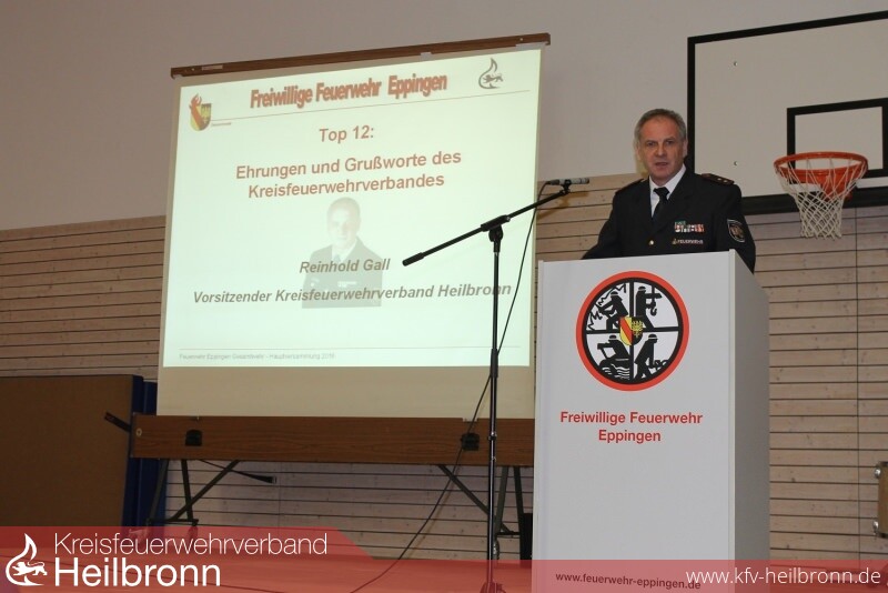In seinen Grußworte lobte Reinhold Gall neben der sehr aktiven Gesamtwehr auch den sehr guten Ausbildungsstand der Gesamtwehr Eppingen im Landkreis Heilbronn. Die Wehr ist seht gut aufgestellt und mit den gebildeten Löschzügen für die Zukunft und die Bereitstellung der wichtigen Tagesverfügbarkeit gewappnet.