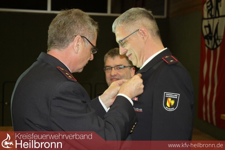 Nach dem Bericht des Kommandanten konnten durch den Vorsitzenden des Kreisfeuerwehrverbandes Heilbronn, Reinhold Gall, die Kameraden Alexander Wagner und Frank Pitz die Ehrennadel des Verbandes erhalten. Das langjährige Wirken der Beiden bei Einsatz und Ausbildung ist vorbildlich und zum Wohle der Gesamtwehr Eppingen. So arbeitet Frank Pitz auch noch aktiv beim Führungs- und Einsatzstab des Landkreises Heilbronn mit und Alexander Wagner steht als Gründer der historischen Wehr dieser noch vor. Hier ist nicht nur der 1. Rang beim Handdruckspritzenwettbewerb 2016 in Sternenfels wichtig, sondern auch die positive Außenwirkung für den Kreisfeuerwehrverband Heilbronn auf Landesebene.