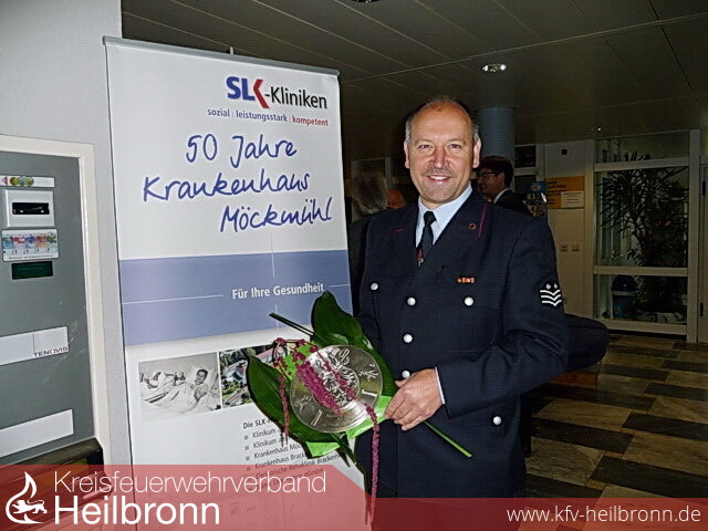 Auch die Feuerwehr erhielt eine Einladung und Kommandant Uwe Thoma vertrat, mit seiner Frau, die Hilfs- und Rettungseinrichtung. Als äußeres Zeichen der engen Verbundenheit und der sehr guten Zusammenarbeit zwischen Krankenhaus und Feuerwehr sowie zur Erinnerung an diesen Festtag, überreichte er im Namen der Feuerwehr Möckmühl einen gravierten Zinnteller.