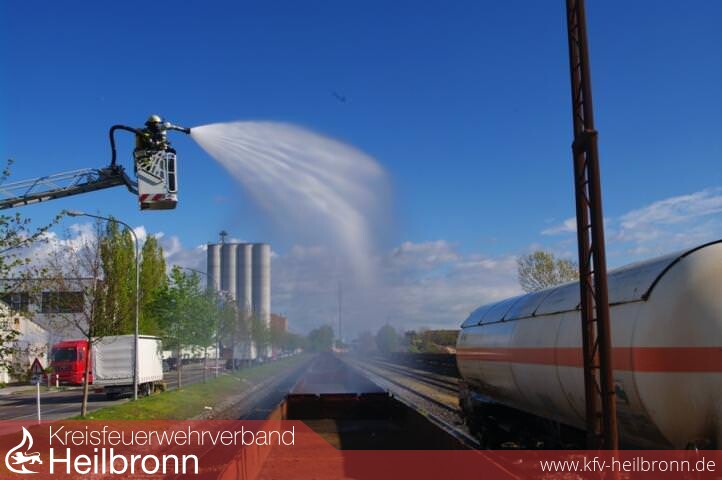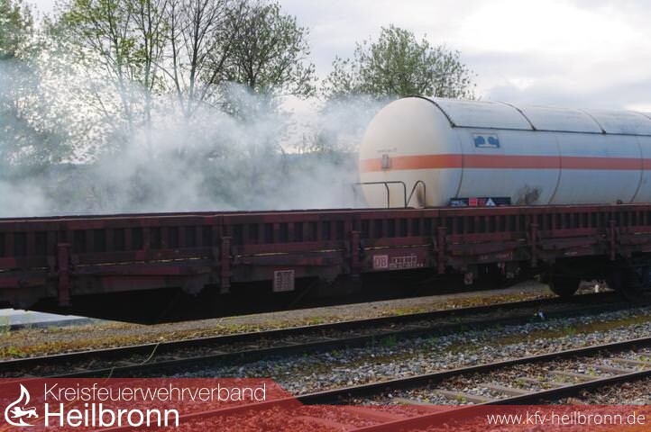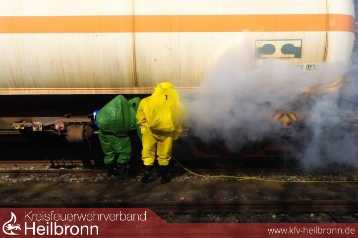 In Spezialschutzanzügen drangen Feuerwehrkräfte zu der Rauchwolke an dem Kesselwaggon auf den Gleisen vor, wo sie das Leck abdichteten. Beim Brand in einem Werkstattgebäude mussten Opfer aus dem Gebäude befreit werden.
