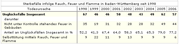 Siehe Tabelle: Sterbefälle infolge Rauch, Feuer und Flamme in Baden-Württemberg seit 1998