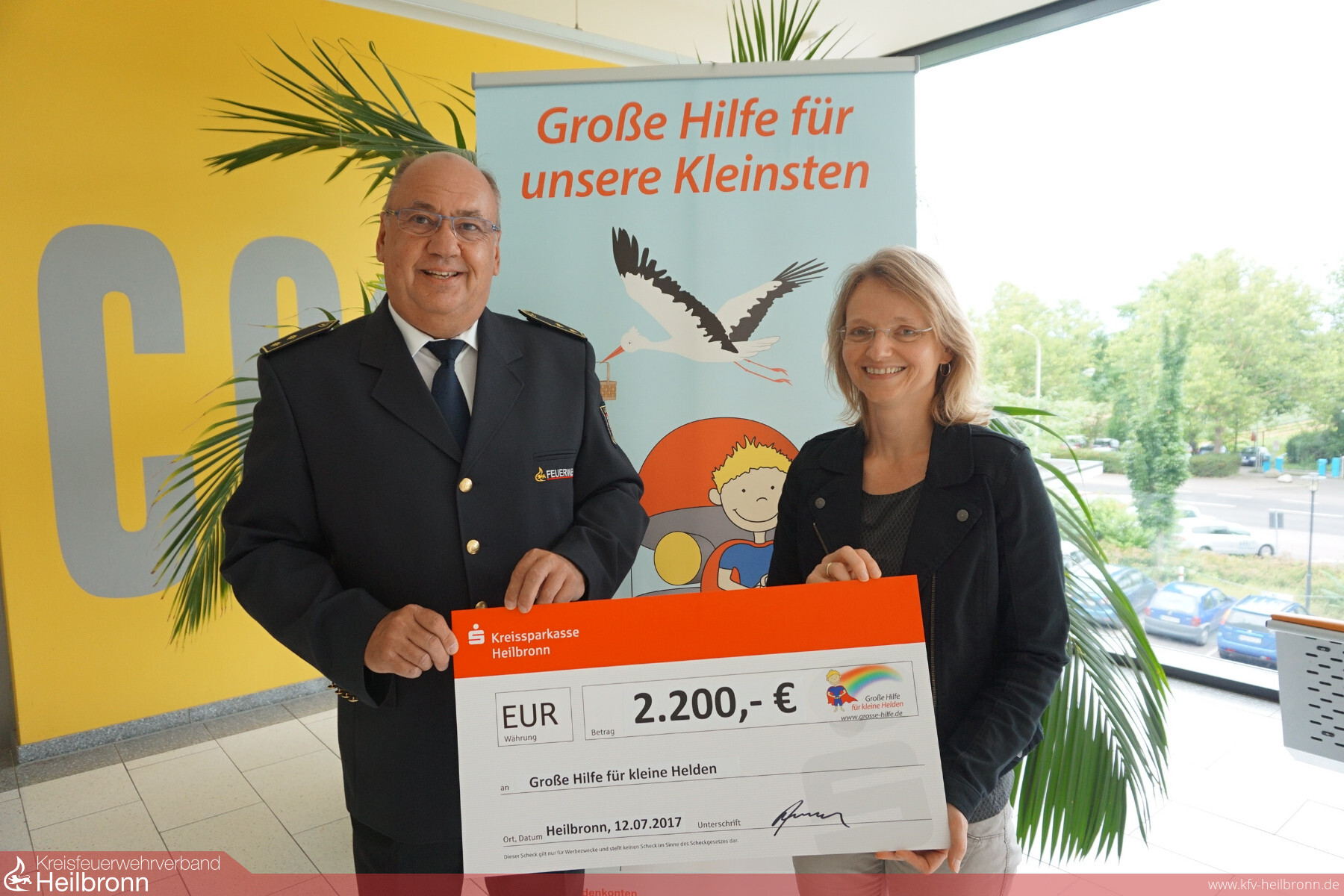 Kreisbrandmeister Uwe Vogel hatte allen Grund zum Feiern. Seinen 60. Geburtstag nahm er zum Anlass um die Stiftung „Große Hilfe für kleine Helden“ zu unterstützen. Bereits im Vorfeld ließ er seine Gratulanten und Geburtstagsgäste wissen, dass er gerne auf Geschenke verzichten möchte und stattdessen um eine Spende bittet. Die Kommunen der Landkreise, die Feuerwehren des Landkreises Heilbronn und auch sein privates Umfeld waren sehr großzügig. Uwe Vogel stockte den Betrag auf und überreichte einen Spendenscheck in Höhe von 2.200 Euro an Stiftungsmitarbeiterin Irina Riedel. „Schon von Berufswegen habe ich den Landkreis im Auge und daher ist es mir auch ein Anliegen, mit meiner Spende in der Region zu bleiben“, erklärte Uwe Vogel bei seinem Besuch in der Kinderklinik sein Engagement für die „kleinen Helden“.