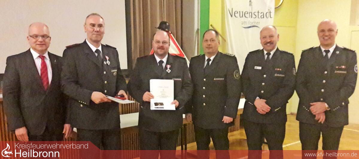 So wurden Andreas Mall, Hauptfeuerwehrmann von der Abteilung Stein-Kochertürn, und Roland Dierolf, Hauptfeuerwehrmann in der Abteilung Neuenstadt, für 25 Jahre aktiven Dienst bei den Brandbekämpfern mit dem Feuerwehr-Ehrenzeichen in Silber des Landes Baden-Württemberg ausgezeichnet.