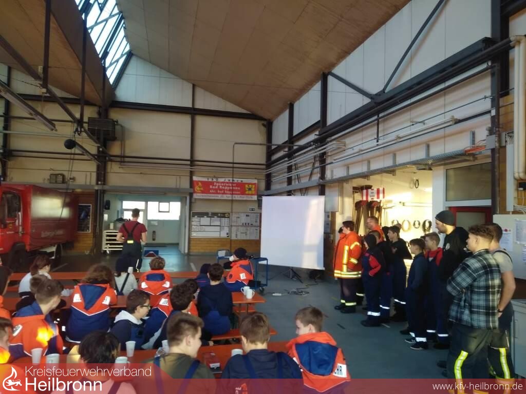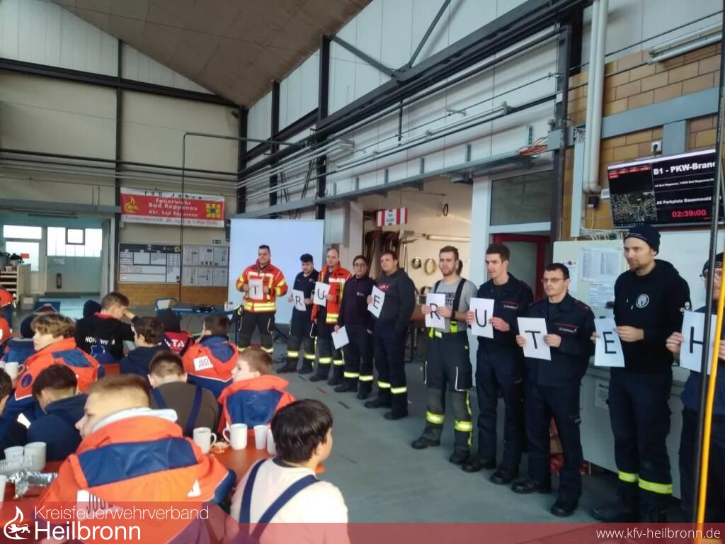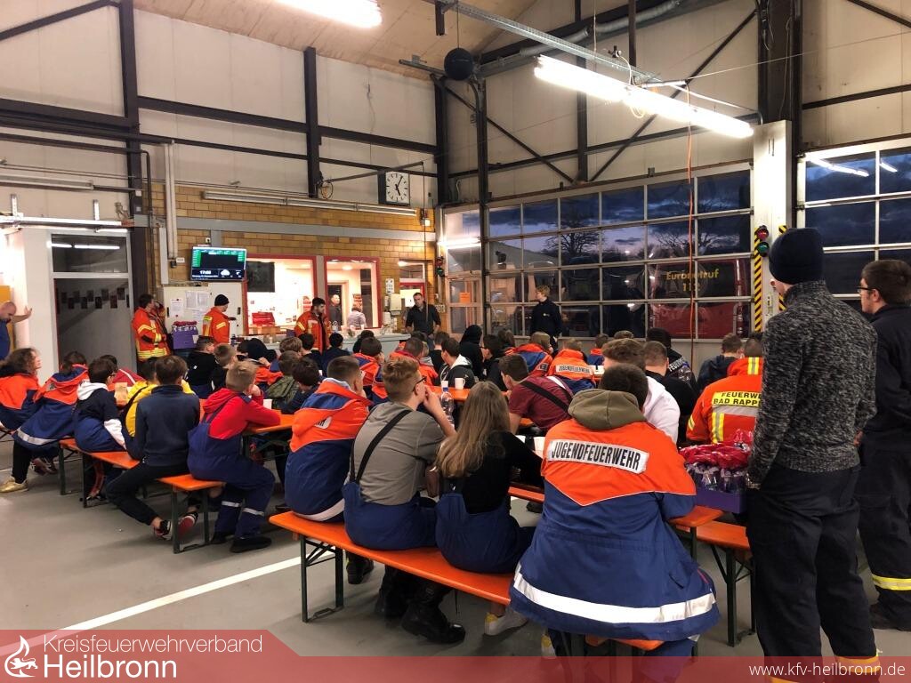 Nachdem die Kalender verteilt und alle Jugendgruppen wieder im Feuerwehrhaus zurück waren, ging es mit dem zweiten Teil des Tages weiter, der Weihnachtsfeier von Jugendfeuerwehr, Betreuern und Helfern. Hierzu wurden Punsch, Plätzchen, Spekulatius und Lebkuchen aufgetischt. Nachdem sich alle aufgewärmt, gestärkt und erholt hatten, gab Mathias Borth einen Ausblick auf das Jahr 2020 und die Veränderungen, welche im Bereich der Jugendfeuerwehr anstehen. So wurde den Jugendlichen und Betreuern das Ressortmodell inklusive aller zugehörigen Maßnahmen im Voraus (Klausurtagungen, Personalumfragen, Betreuerinformationstage usw.) erklärt und die besondere Bedeutung für eine altersgerechte, attraktive und zeitgemäße Jugendarbeit hervorgehoben. Ab 1. Januar 2020 werden im Ressort Süd die Jugendgruppen Babstadt und Süd (Bonfeld, Fürfeld, Treschklingen) unter Ressortleiterin Jana Tiedt, sowie im Ressort Mitte die Jugendgruppen Bad Rappenau, Grombach, Heinsheim, Obergimpern und Wollenberg unter Ressortleiter David Müller gemeinsam in verschiedenen Altersgruppen üben.