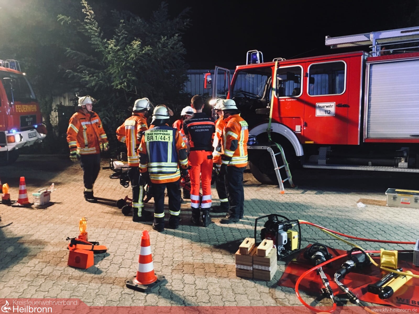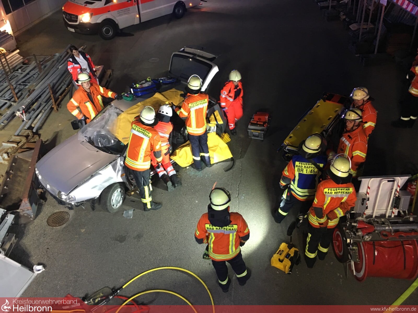 Über den örtlichen Kontakt mit der Rettungswache 5 der DRK-Rettungsdienste gGmbH, wurde ein gemeinsamer Fortbildungsabend organisiert. Ziel war es, unter realistischen Bedingungen das gemeinsame Vorgehen bei Verkehrsunfällen zu üben. Seitens des DRK waren einige Notfallsanitäter in Ausbildung sowie deren Ausbilder inkl. zwei Rettungswagen anwesend.