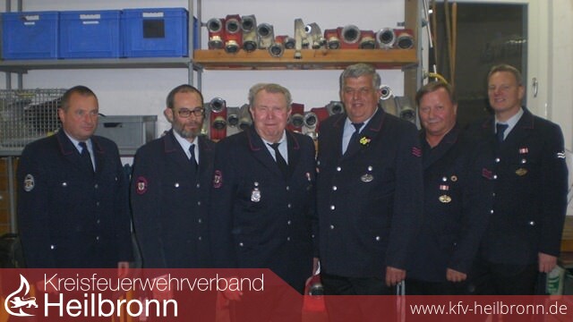 v.l.n.r. Kommandant Wolfgang Rauh, Günter Haas, Emil Höpfer, Werner Weybbecht, Leiter der Altersabteilung Gerhard Scheuermann, Abteilungskommandant Werner Seufer
