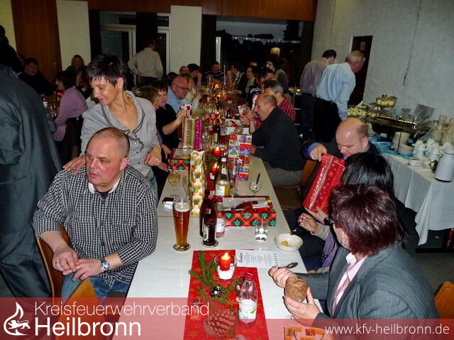 Nach dieser Ansprache erfolgte die Bescherung, jede Ehefrau, Freundin oder Partnerin erhielt ein Geschenk, da diese pro Jahr ca. 70 Einsätze, zahlreiche und vielfältige Sonderaufgaben sowie fast 50 Übungsdienste am Freitagabend mittragen und das erforderliche Verständnis hierzu aufbringen müssen. Weiterhin überreichte der Kommandant seinen beiden Stellvertretern, dem Schriftführer und Kassier, den Jugendbetreuern, den Ausbildern, den Landfrauen und dem Bürgermeister eine Aufmerksamkeit für die gute Unterstützung im zurückliegenden Jahr.In diesem Jahr wurde hierzu ein Möckmühler-Paket zusammengestellt, welches aus einem Möckmühler Wein/Sekt, einem Stollen sowie zwei Paar Würsten, alles mit Möckmühler Schillerwein hergestellt, bestand.