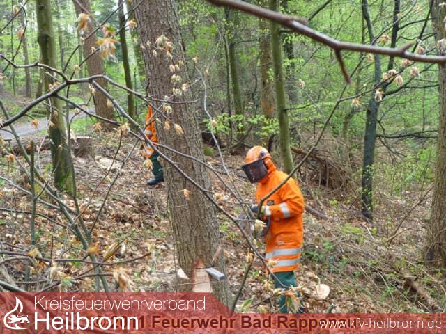 Verursacher waren die Kameradinnen und Kameraden der Feuerwehr Bad Rappenau (der Abteilungen Babstadt, Bad Rappenau, Bonfeld, Fürfeld, Obergimpern und Treschklingen), welche an einem Kettensägen-Grundlehrgang des Forstamtes Schwarzach teilnahmen.