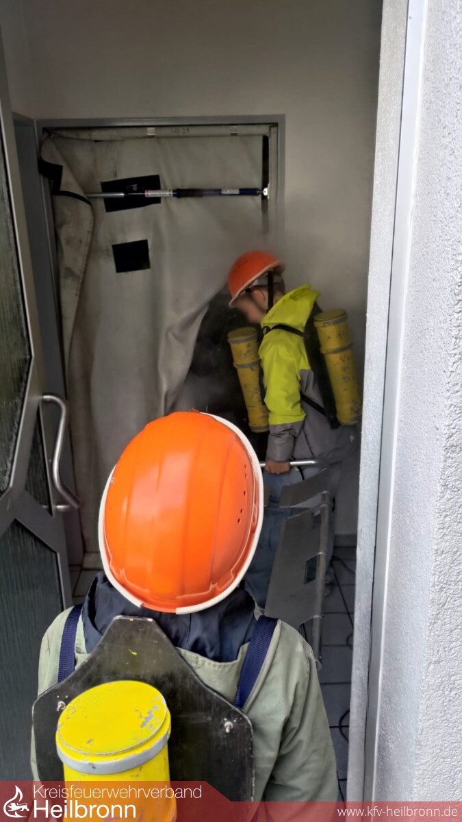 An der zweiten Station wurde ein Raum künstlich eingenebelt, in dem mithilfe der Wärmebildkamera nach vermissten Personen gesucht werden durfte. Zum Schutz vor Rauchgasen hatten die Kinder sich mit „Atemschutz“ (Attrappen) ausgerüstet. Die „gerettete“ Übungspuppe wurde im Anschluss mit einer Trage ins Freie transportiert.