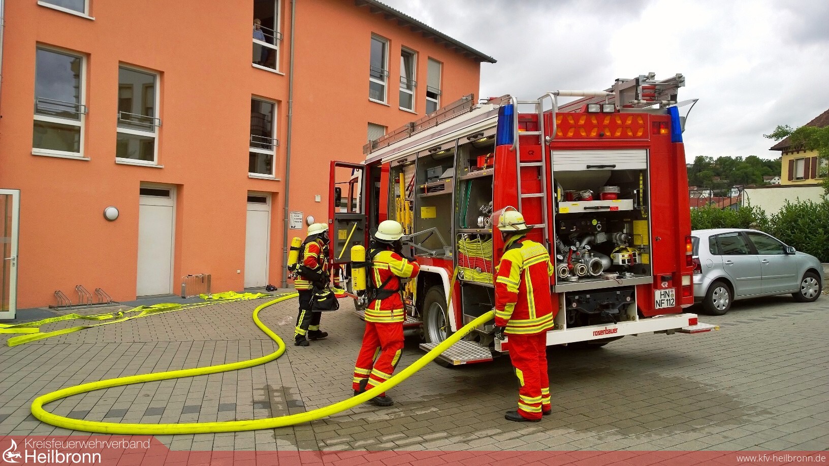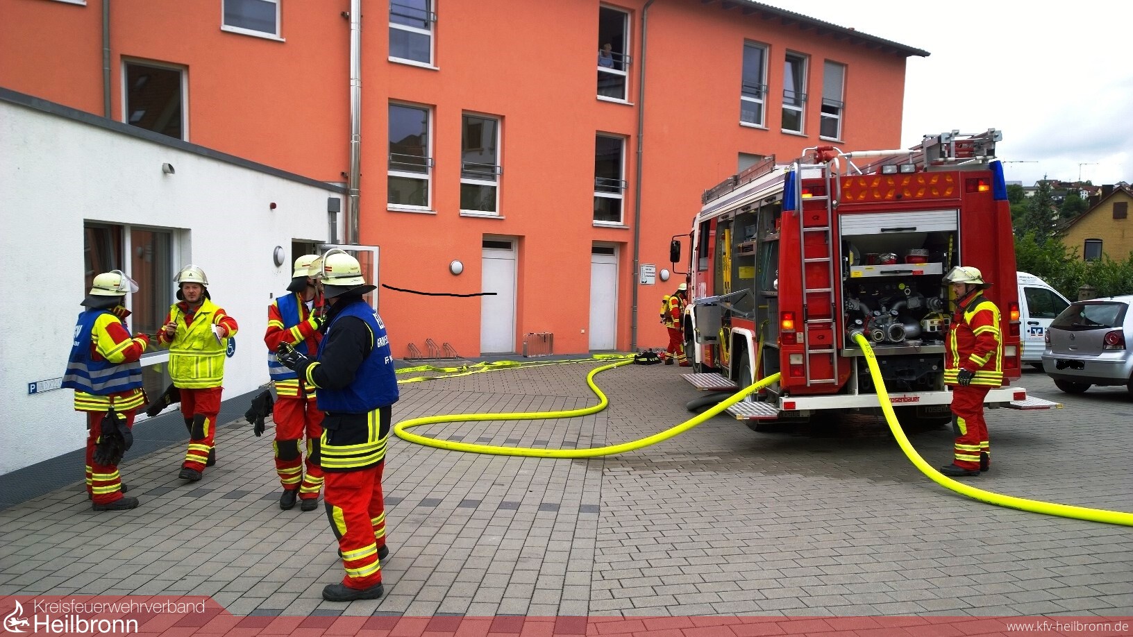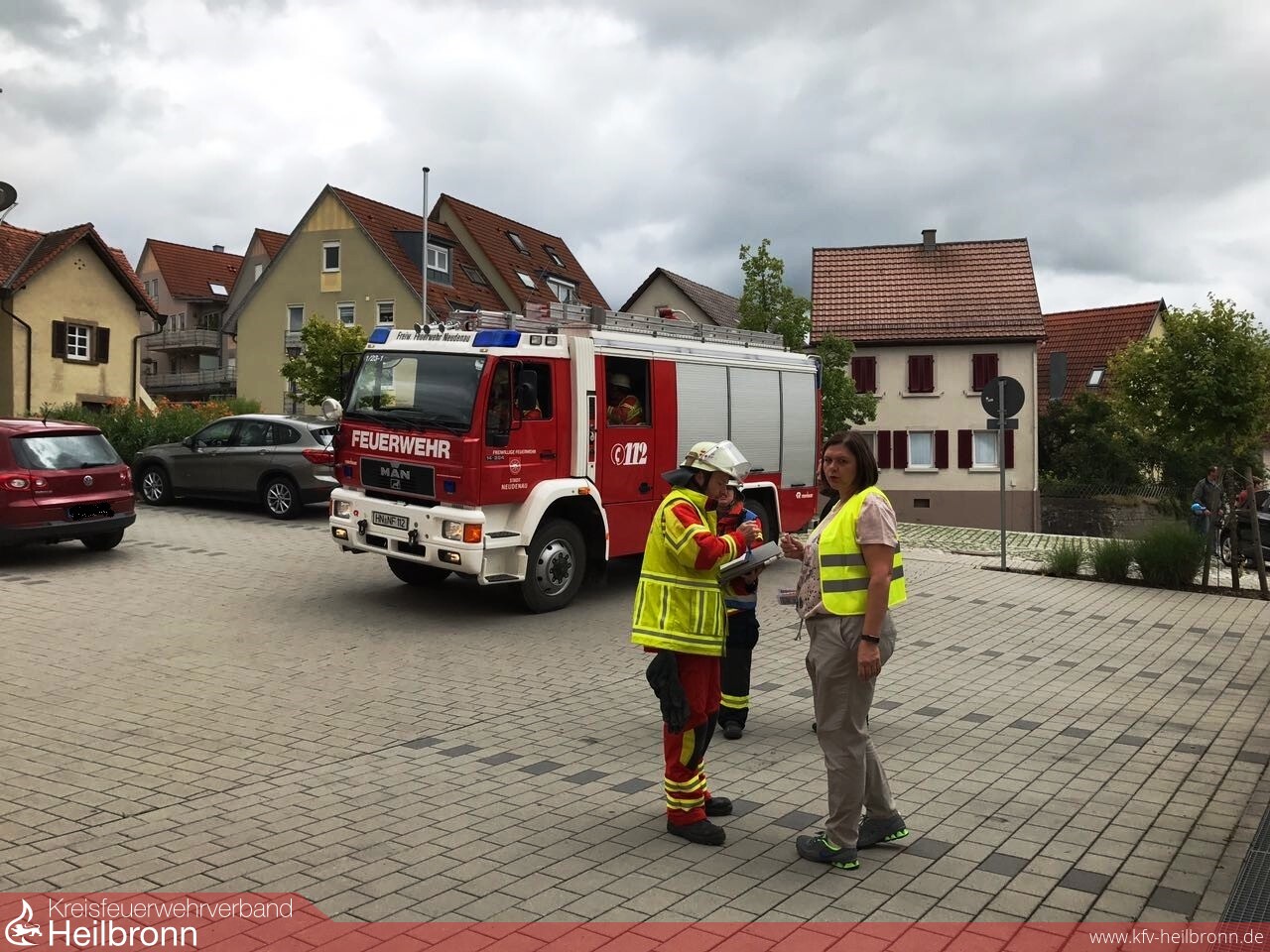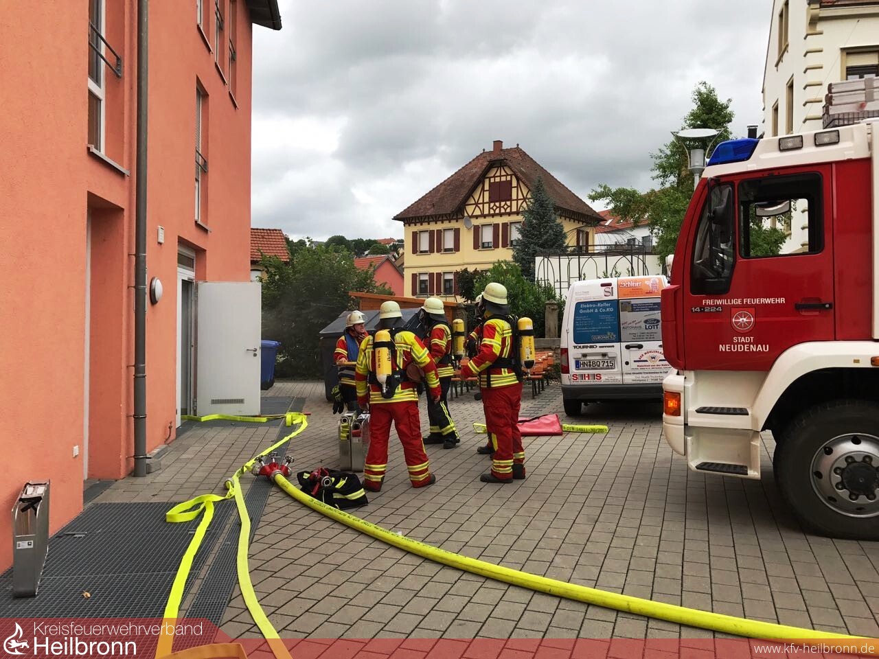 Eine unangekündigte Alarmübung fand bei der Feuerwehr Neudenau statt. Um 14.39 Uhr wurden alle drei Einsatzabteilungen zum Seniorenheim Haus am Lindenplatz alarmiert. Die Brandmeldeanlage hatte ausgelöst. Beim Eintreffen von Einsatzleiter Uwe Amann, quoll Rauch aus den Lüftungsgittern des Recycling- und Müllraumes. Er entschloss sich den Brand, durch die Außentüre, von der Besatzung des Neudenauer Tanklöschfahrzeuges (TLF 16/25) bekämpfen zu lassen. Seine weitere Erkundung ergab, dass die Räume im Bereich des Flügels, in dem der Brand wütete, durch das Team des Seniorenheimes, bis auf zwei bettlägerige Personen, bereits vollständig geräumt wurden. Um diese beiden Personen kümmerte sich dann die Besatzung des Gerätewagen-Logistik (GW-L2) und brachte sie aus dem gefährdeten Bereich. Nach Eintreffen des Siglinger Staffellöschfahrzeuges (StLF 10/6) erfolgte von diesem Fahrzeug die weitere Wasserversorgung des TLF 16/25 und es wurden weitere Atemschutztrupps gebildet.