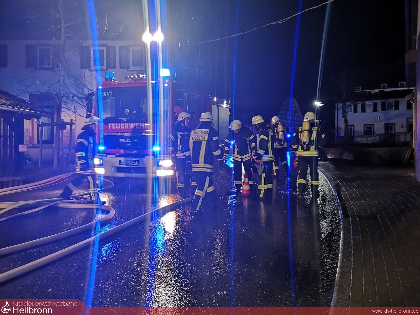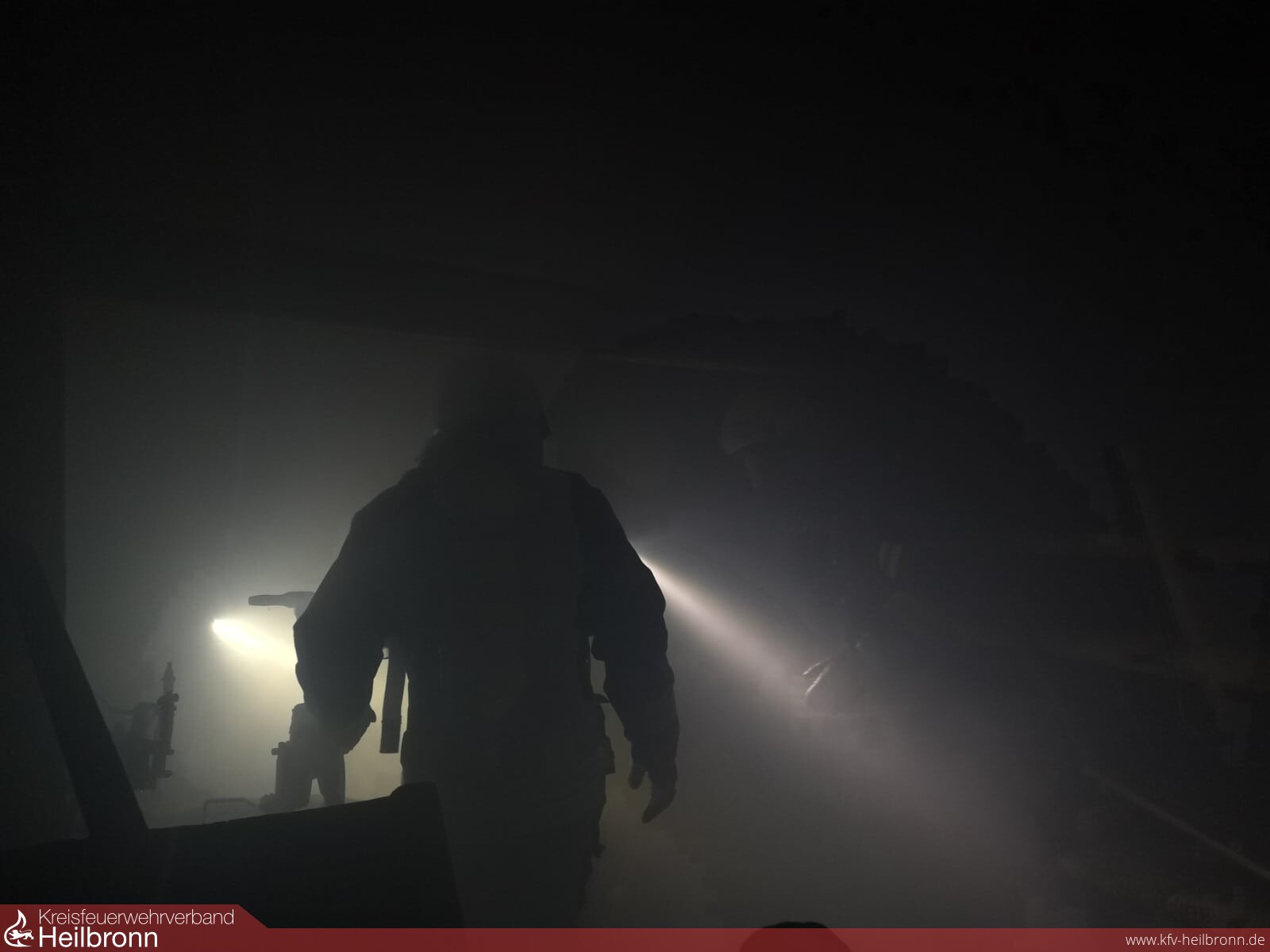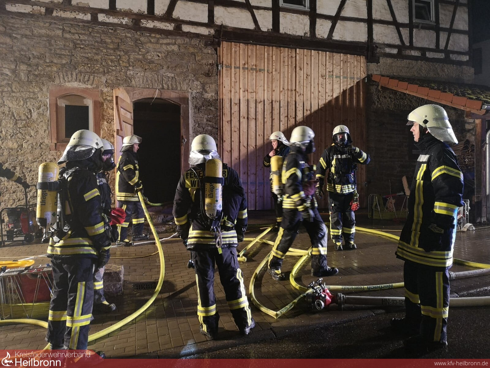 Vier Trupps unter Atemschutz gingen zur Personensuche in das Gebäude vor, zeitgleich wurde die Wasserversorgung von der Kessach zur Versorgung des Tanklöschfahrzeugs aufgebaut.