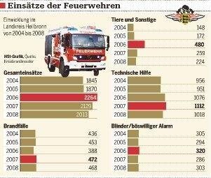 Rechnerisch alle vier Stunden muss die Feuerwehr ausrücken. 2013 Einsätze verzeichneten die Floriansjünger im Landkreis Heilbronn im Jahr 2008 - etwas weniger als in den Jahren davor. Die technischen Hilfeleistungen standen weiter im Vordergrund (siehe Grafik), die Zahl der Brände ist nahezu gleich geblieben, der Anteil der Großbrände war erneut hoch.