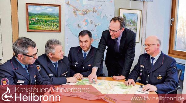 Bild 1: Bürgermeister Tilman Schmidt (stehend) mit den Kommandanten (v.l.) Andreas Fensch, Michael Schepperle, Bernd Frisch und Reiner Schüro.