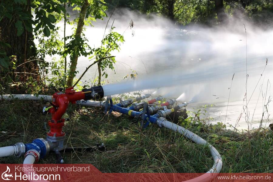 Ein möglichst schneller Abbau des Ammoniums in der Jagst bis zur Neckarmündung ist Ziel der Bekämpfungsmaßnahmen im Landkreis Heilbronn. Unter Federführung der Einsatzleitung im Feuerwehrhaus Möckmühl wird der Fluss an der Kreisgrenze Hohenlohe/Heilbronn von Feuerwehr und THW weiterhin stark belüftet.