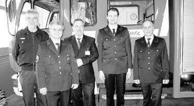 Foto: Die neue und alte Crew beim Stabwechsel: Kreisbrandmeister Hans-Wilhelm Hansmann, Michael Stark, Klaus Kupfer, Andreas Schick und Wolfgang Fischer (von links). (Foto: Karin Freudenberger)