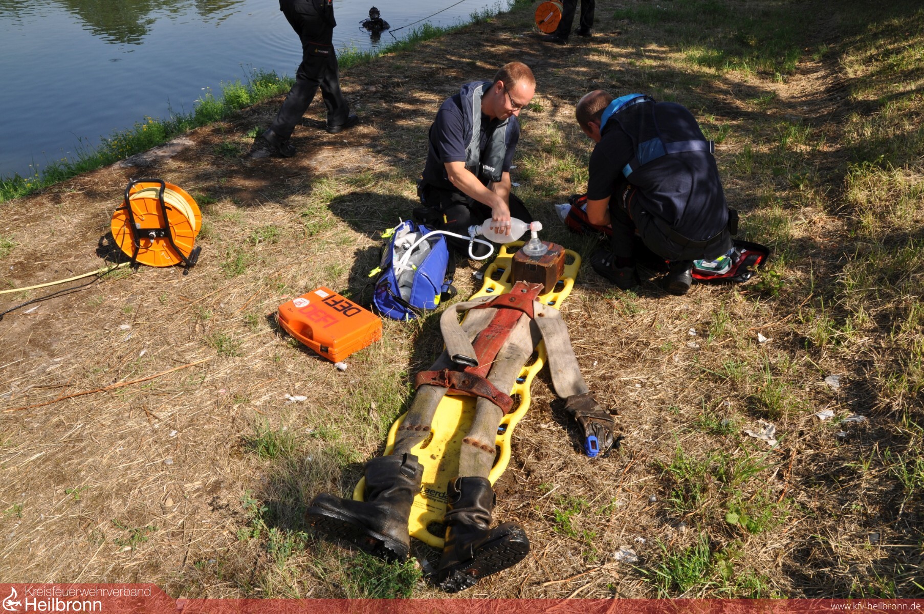Dann geht alles ganz schnell: Mehrere Taucher gehen ins Wasser und suchen in Halbkreisen den Grund des Neckars ab, bis ein Sucherfolg vermeldet werden kann. Bereits nach kurzer Zeit kann die Übungspuppe erfolgreich aus dem Fahrzeug befreit und am Ufer versorgt werden. „Die Person konnte wiederbelebt werden“, meldet die Ausbildungsgruppe. Anschließend wird das rote Fahrzeug, das die Feuerwehr am Vortag an selber Stelle versenkt hatte, per Seilwinde ans Ufer gezogen und dann mit dem Feuerwehrkran aus dem Neckar gehoben.
