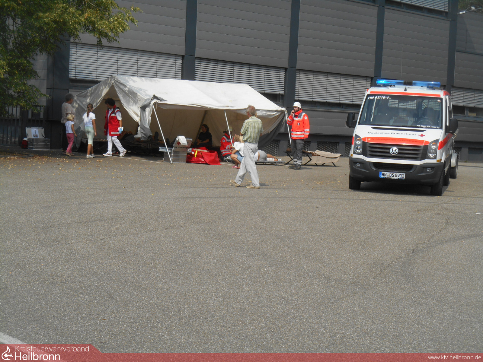 Zügig konnten sechs verletzte Personen aus dem Firmengebäude gerettet und den „Helfern vor Ort“ des DRK übergeben werden. Der DRK Ortsverein Gemmingen hatte in der Zwischenzeit auf dem benachbarten Parkplatz der Metallwarenfabrik Gemmingen einen Behandlungsplatz mit Zelt aufgebaut. Nach einer Erstversorgung wurden die Verletzten zur weiteren Behandlung hierhin transportiert. Um die Verletzungen möglichst real aussehen zu lassen, wurden die Statisten bereits vor der Übung vom DRK geschminkt. Dadurch konnten zum Teil schwere Verletzungen durch die Sanitäter diagnostiziert werden, wie etwa Brandverletzungen, Fraktur, Rauchgasintoxikation oder Schnittwunden.
