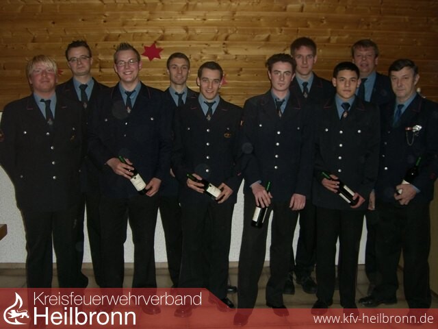 Für regelmäßigen Übungsbesuch bekamen Patrick Bucher, Daniel Bucher, Simon Gref, Renè Harein, Alexander Krysiak, Matthias Löbe, Jan Marquetand, Martin Bothner und Rudolf Uhland ein kleines Weinpräsent. Eine beachtliche Leistung bei diesem anstrengenden Dienstjahr. Nachdem Abt. Kommandant Wind die Generalversammlung mit dem alten und eher unbekannten Feuerwehrleitspruch „Es ist uns eine Ehr, zu dienen in der Feuerwehr“, schloss, lud die Abteilung noch zum gemeinsamen Essen ein.