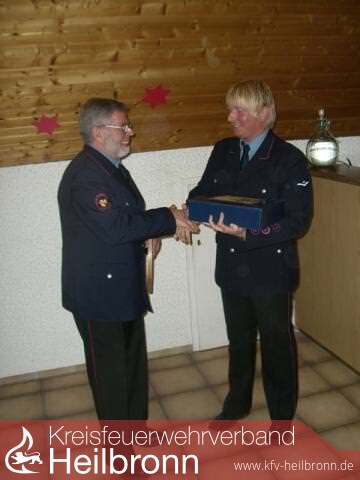 Gesamtkommandant Reinhard Frank, welcher im Februar sein Amt aufgibt, dankte nochmals allen Kameraden und den Kommandanten und Stellvertretern für die immer faire und fruchtbare Zusammenarbeit in den letzten Jahrzehnten. Unter Verschiedenes dankte die Abteilung Reinhard Frank mit einem kleinen Weinpräsent und dem „Gardicher Wappen“ für seine sehr gute Arbeit zum Wohle der Feuerwehr. Auch ohne Amt und Würden ist er in Kleingartach immer ein gern gesehener Gast.