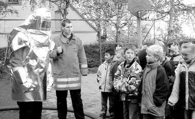 „Viele Kinder sind verängstigt, wenn sie zum ersten Mal einen Wehrmann mit Gasmaske und Axt sehen“, meint Jugendfeuerwehrwart Andreas Stiefel. Dass Wehrleute, die in ihren silbernen Einsatzanzügen wie Außerirdische aussehen, einen gefährlichen Job versehen und dabei auch Leben retten, das erfahren die Kinder von den fünf jungen Männern, die sich eigens für den Projekttag Urlaub genommen haben.