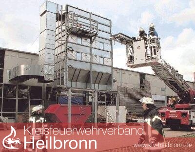 In der Zwischenzeit hat Christian Gruber im ELW per Funk die anderen vier Obersulmer Abteilungen alarmiert. Nach 15 Minuten trifft die Drehleiter am Einsatzort ein. Das Szenario sieht vor, eine verletzte Person in acht Meter Höhe von der engen Plattform des Späne-Silos der fabrikeigenen Schreinerei zu bergen. „Wir unterstützen die Besatzung der Drehleiter“, wartet Gruppenführer Harald Frech darauf, dass Karl-Ulrich Vollert und Ernst Dorsch den „Verletzten“, eine schwere Puppe, sicher auf den Boden bringen.