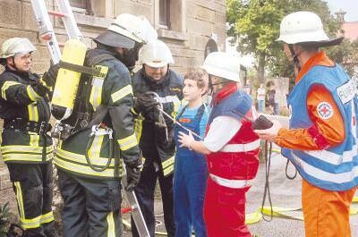 Mit Leiter Die drei Eingeschlossenen rettet die Mannschaft des LF. Zwei Teile der dreiteiligen Leiter werden dafür zusammengesteckt und am Fenster angelegt. Schnell steigen zwei Männer hoch und bringen die Jungs der Jugendfeuerwehr, die wieder die Verletzten spielen dürfen, mit der Rettungsleine gesichert, nach unten. Die Erstversorgung übernimmt die Schnelleinsatzgruppe (SEG) der Lauffener DRK-Bereitschaft. Einsatzleiter Uwe Haegler ist mit fünf Leuten und zwei Fahrzeugen angerückt.