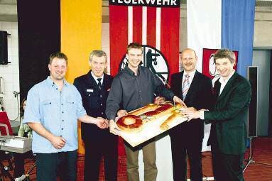 Bild: Schlüsselübergabe mit Backwerk: (von links) Bauhofleiter Uwe Sandler, Feuerwehrkommandant Manfred Rapp, Bauleiter Erik Bossog, Bürgermeister Klaus Dieterich, Architekt Dieter Guttenberger. (Foto: Claudia Wachter)