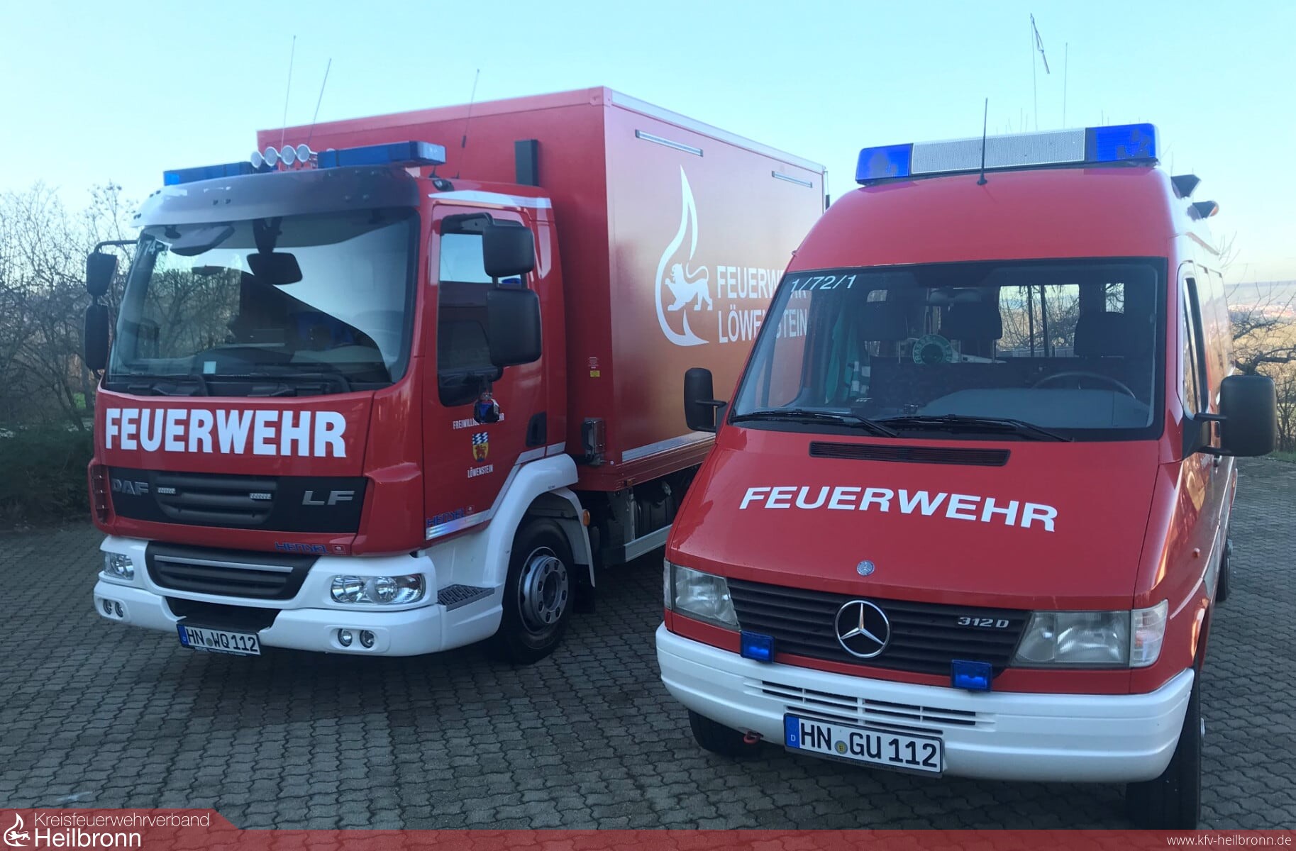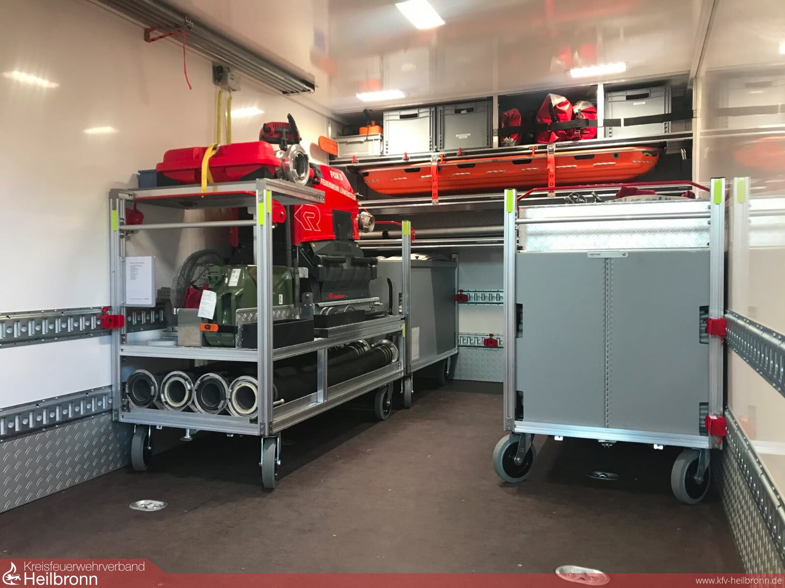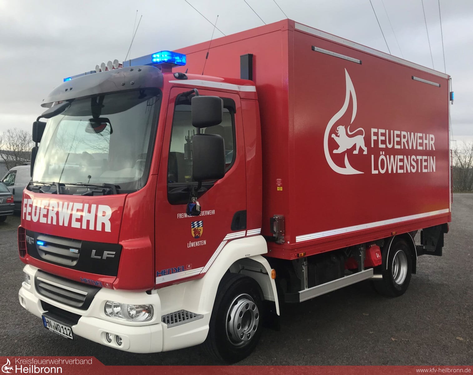 Damit endet eine rund 2-jährige Beschaffungszeit, beginnenden mit der Bedarfs- und Kostenanalyse Ende 2017, anschließendem Beschluss des Gemeinderats zur Beantragung des Zuschusses für ein Gebrauchtfahrgestell > 7,5 Tonnen und der Freigabe zur Beschaffung. Danach die schwierige Suche nach einem passenden gebrauchten LKW, hier konnte man einen 4,5 Jahre alter DAF LKW mit 48.000km Laufleistung erwerben. Nach Eingehen des Zuschussbescheids konnte die Ausschreibung in 3 Losen zum Umbau, für die Beladung, sowie die Lieferung der Rollwägen erstellt werden. Erwähnenswert ist hier die Eigenleistung der Feuerwehr Löwenstein, welche die Leistungsverzeichnisse komplett in Eigenregie erstellte. Der Auftrag konnte dann im Dezember 2018 an die Fa. Hensel, Waldbrunn für den Umbau und die Lieferung der Rollwägen und an die Fa. Kumle Feuerwehrtechnik, Dietingen für die Lieferung der Beladungsgegenstände vergeben werden.