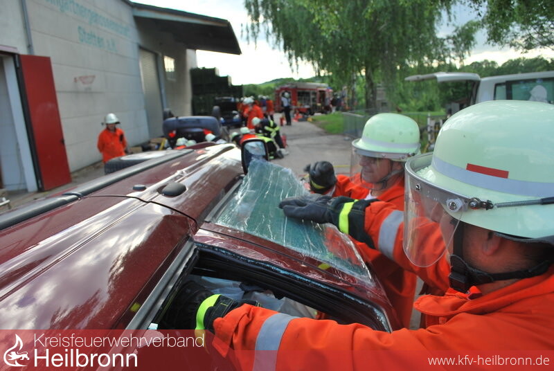 Am zweiten Abend konnte all dies in die Praxis umgesetzt werden. An drei Stationen mussten unterschiedlich Unfallszenen in Gruppenarbeit bewältigt werde. Dabei wechselten die Gruppen durch, so dass jede Gruppe ein mal an jeder Station arbeitet. Dabei musste jeweils eine Erstöffnung, eine Versorgungsöffnung und eine Befreiungsöffnung hergestellt werden. Zu den bereits bekannten Techniken wurden vom Ausbilder ständig neue Möglichkeiten vorgestellt und getestet. Mit staunen konnte so immer wieder erkannt werden, was mit Hilfe der Geräte machbar ist, wenn man weiß wie man vorgehen kann.