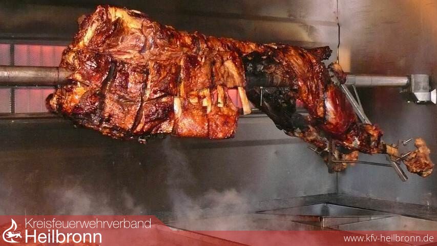 Für die Organisatoren ist es immer schwierig zu viele Gäste an einem Ort unterzubringen. In Siebeneich/Bretzfeld wurde man bei Weinbau Waibler fündig, der in seiner Halle als Attraktion einen ganzen Ochsen am Spieß anbietet. Der Ochse wird „ganz“ auf den Spieß gehängt und 6-7 Stunden vor dem ersten Anschnitt auf dem Gasgrill bei Temperaturen bis 600* C gedreht. Bis der ganze Ochse fertig ist, dauert der Garprozess bis zu 11 Stunden, ergibt dann aber ca. 430 Portionen wohlschmeckendes, zartes Fleisch, das dennoch Biss hat.