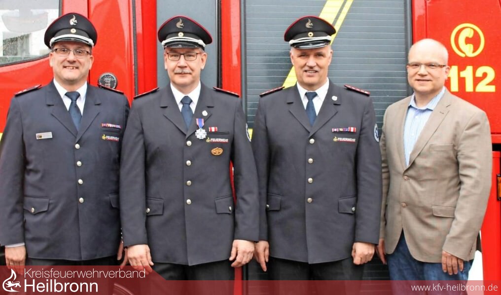 Eine seltene Ehrung gab es beim Neuenstadter Feuerwehrfest für den stellvertretenden Kommandanten Klaus Gussmann. Zusammen mit dem Kommandanten Hartmut Schaffroth und Neuenstadts Bürgermeister Norbert Heuser verlieh Martin Kuhmann vom Kreisfeuerwehrverband Heilbronn Gussmann die zweithöchste Ehrung, das „Deutsche Feuerwehrehrenkreuz in Silber“.