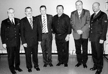 Foto: Dr. Frank Knödler, Präsident des Landesfeuerwehrverbands, Bürgermeister Roland Weinschenk, Bernd Herrmann, Fritz Haag und Michael Kübler (Firma Würth) und Wolfgang Brosig (von links). (Foto: Oliver Färber)