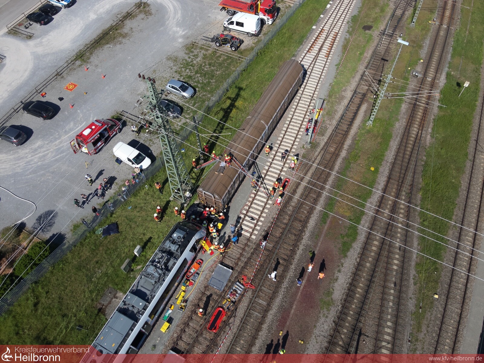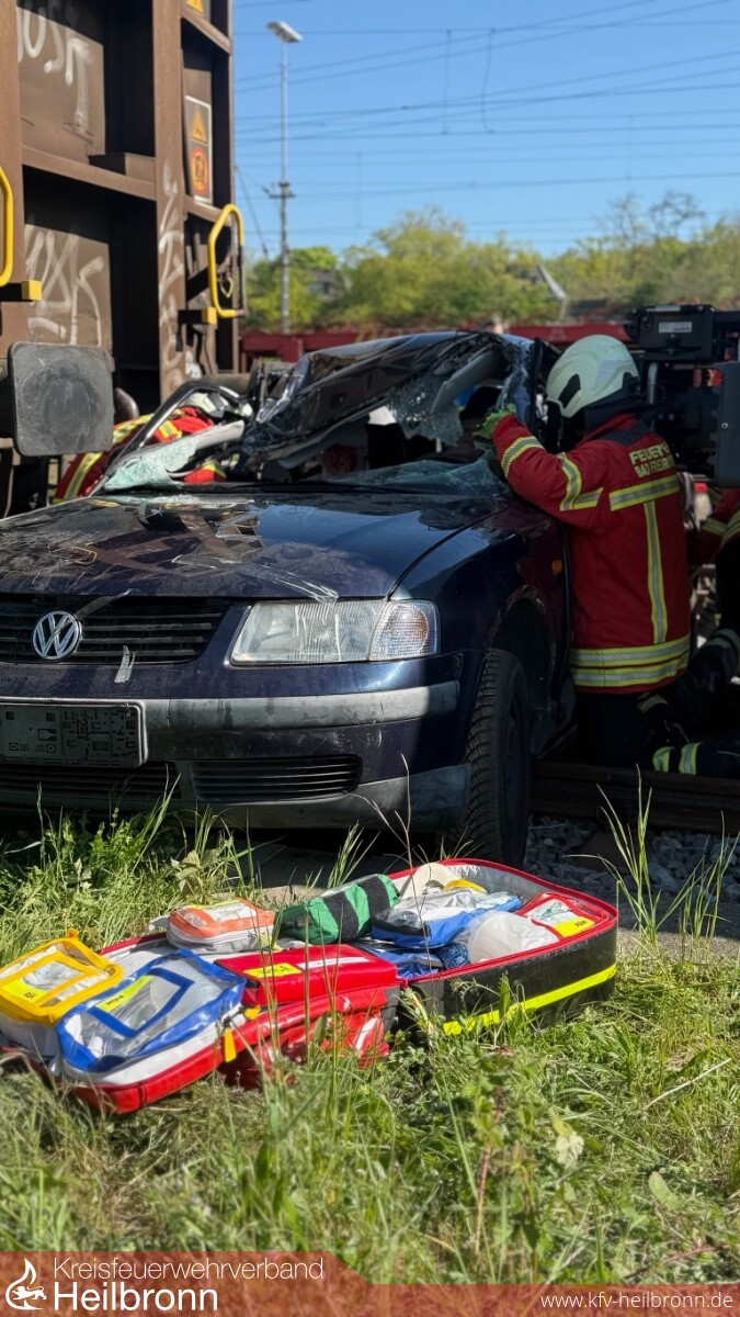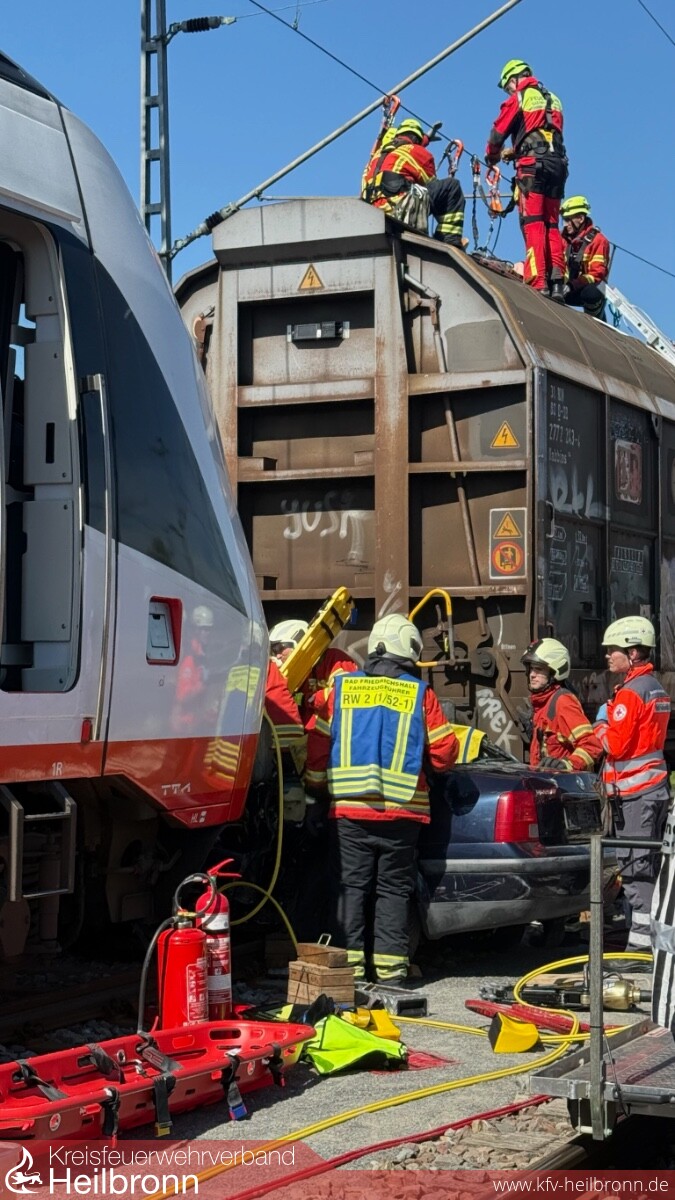 Die Feuerwehr übernahm die Rettung der eingeklemmten Personen aus dem PKW. Eine weitere Person befand sich auf einem Güterwaggon. Deshalb wurde durch den Notfallmanager der Deutschen Bahn zunächst die Oberleitung stromlos geschaltet, damit die Feuerwehr den Gleisbereich betreten konnte.