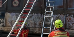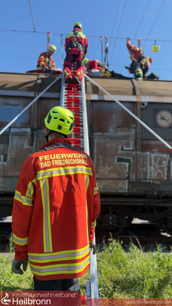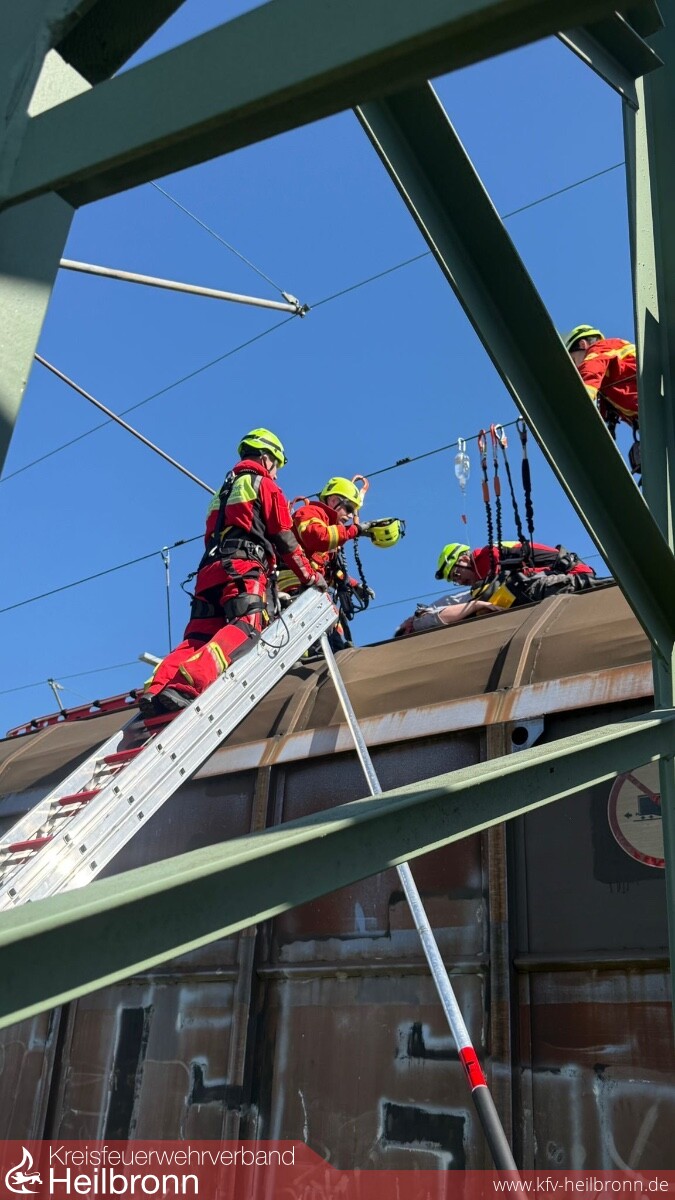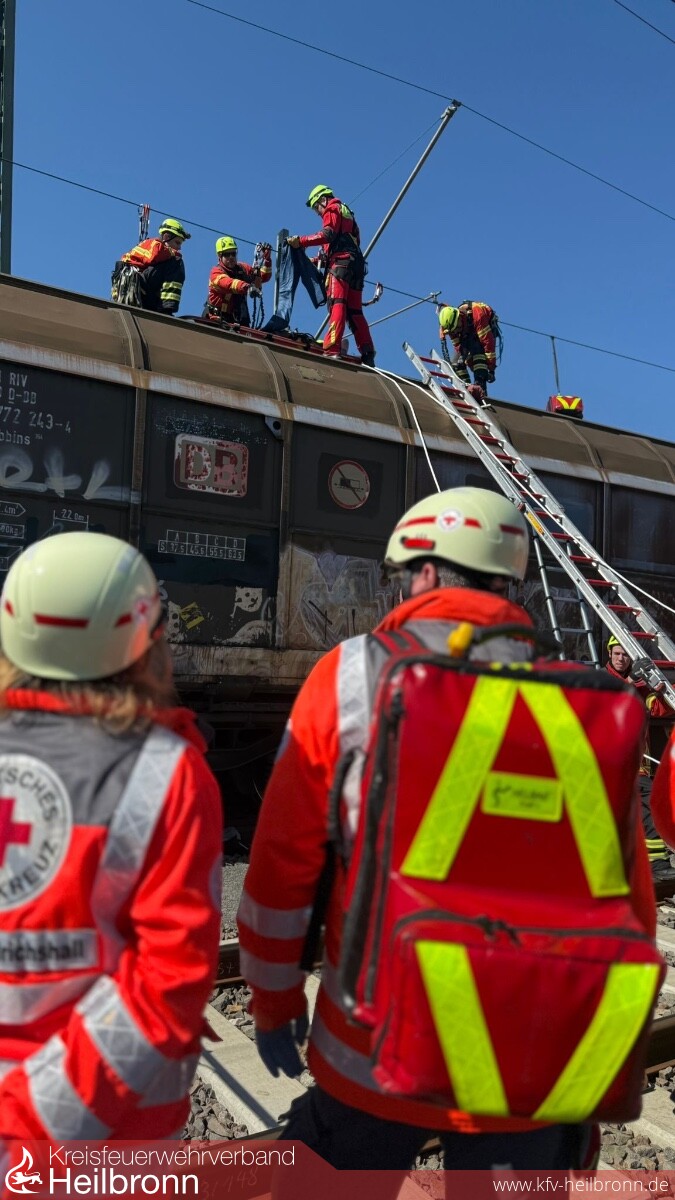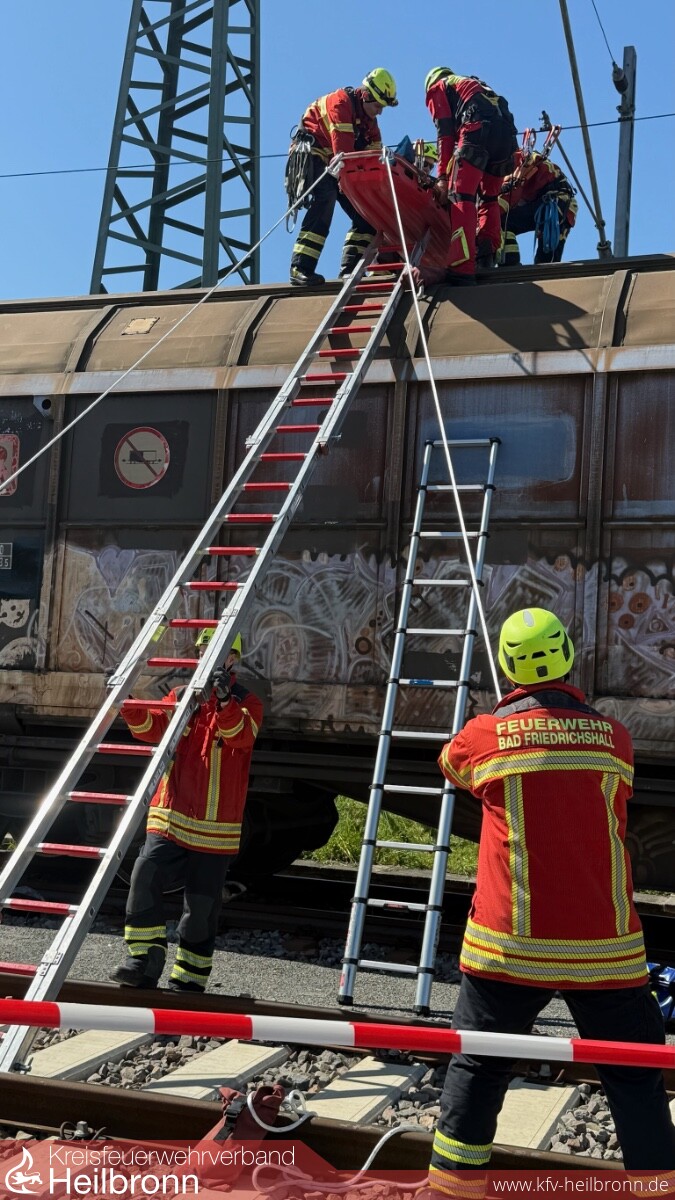 Die Rettung der Person auf dem Waggon erfolgte anschließend durch die Fachgruppe ERHTWE, welche die Person schonend vom Dach des Güterzuges rettete.