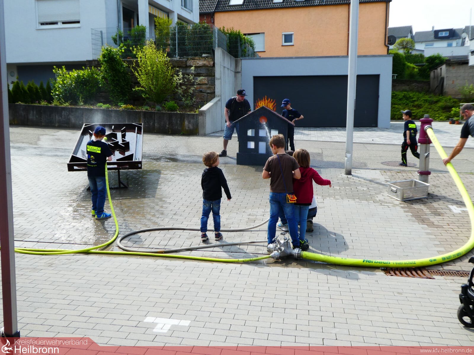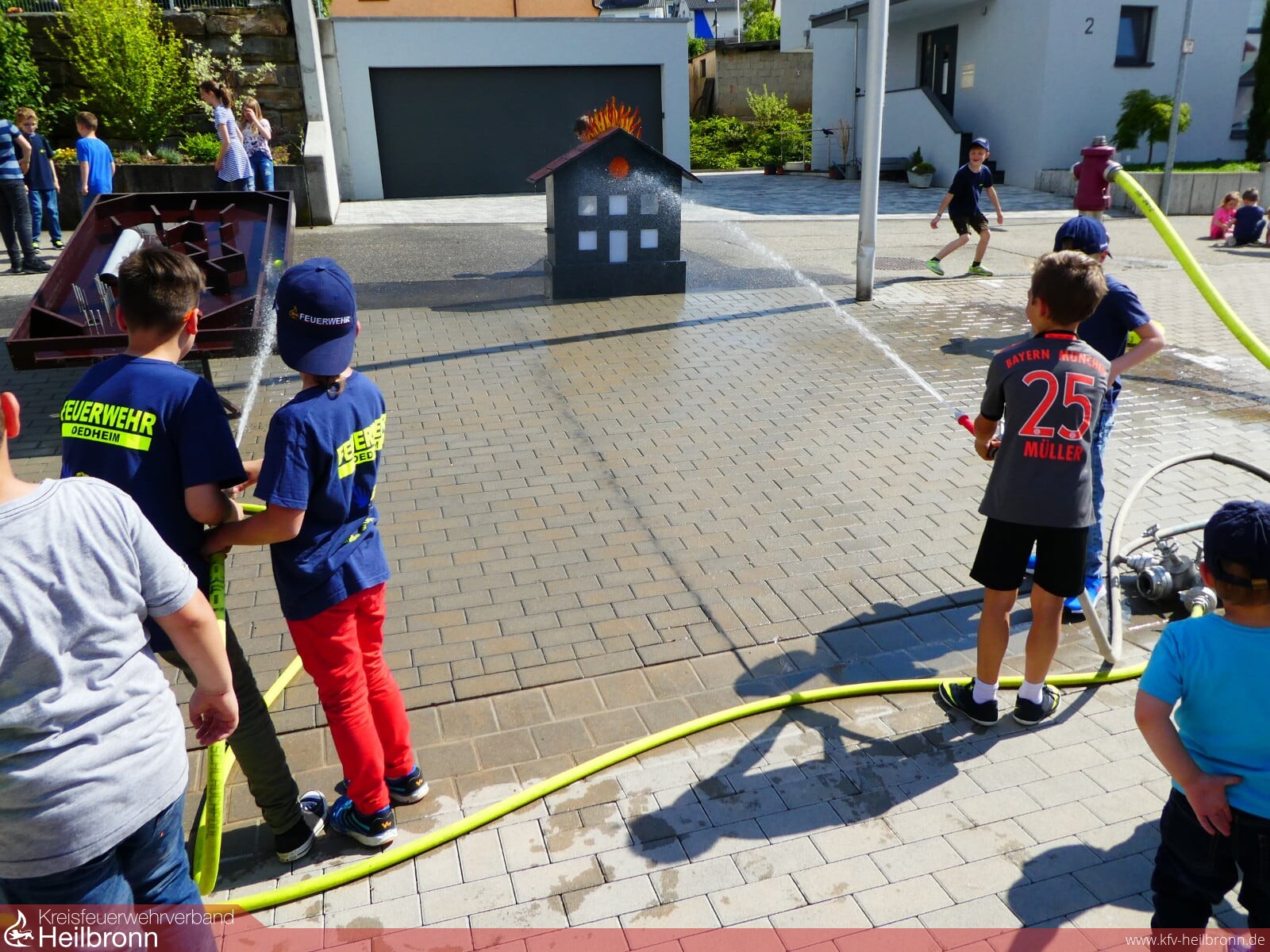 Besonders begeistert waren die vielen Kinder, die sehr gerne das von der Kindergruppe und der Jugendgruppe der Oedheimer Jugendfeuerwehr angebotene Programm ausgiebig nutzten. Die insgesamt 43 Mitglieder der Jugendfeuerwehr um Jugendwart Manuel Baumgart freuten sich sehr über diesen Zuspruch. Bei feuchten Wasserspielen mit dem Strahlrohr, beim Malen von Feuerwehr-Bildern, bei der Tombola und der süßen Zuckerwatte vergnügten sich die künftigen Feuerwehrleute zusammen mit den jungen Kameraden der Jugendfeuerwehr sehr gut. Oft wurde dabei von den Kindern die Frage gestellt, „Wie lange muss ich noch warten, bis ich bei der Kindergruppe mitmachen darf?“.