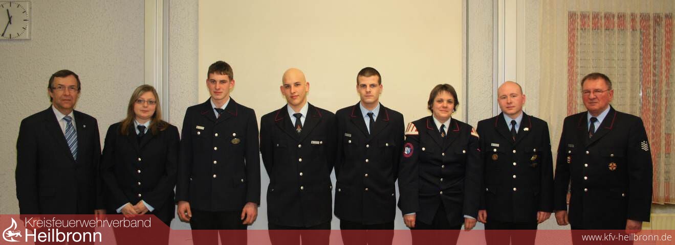 Allen, die zur positiven Entwicklung beigetragen haben, dankte Semen und bot seinem Nachfolger Unterstützung an. Mit lang anhaltendem Applaus bekundeten alle Feuerwehrleute und Gäste Dank und Respekt. Hauptkassier Ulrich Oberhardt freute sich in seinem 20. und letzten Kassenbericht, dass trotz mehrerer Jubiläumsveranstaltungen ein positives Kassenergebnis erzielt wurde. Bürgermeister Peter Dolderer würdigte die ehrenamtlichen Leistungen und Einsätze der Feuerwehrleute zu allen Tages- und Nachtzeiten, während der Arbeit oder in der Freizeit. Besonders dankte er Kurt Semen für seine 30-jährige erfolgreiche Kommandantentätigkeit. Kreisbrandmeister Uwe Vogel lobte die vielfältigen Arbeiten der Feuerwehr Bad Friedrichshall und berichtet über die abgeschlossene Erneuerung der Infrastruktur im Bereich der nichtpolizeilichen Sicherheit im Landkreis Heilbronn. Semen überreichte an die neu ernannte Feuerwehrfrau Sabrina Brühl und an die Feuerwehrmänner Matthias Bauer, Raphael Geist und Timo Maier Ernennungsurkunden. Befördert wurden Marcel Bauer zum Oberfeuerwehrmann, Anita Remmlinger zur Hauptfeuerwehrfrau, Michael Reithmeyer zum Oberlöschmeister.