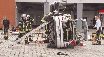 Behutsam setzen die Wüstenroter Feuerwehrmänner Christian Rudert und Jürgen Schaffert den Rettungszylinder am eingedrückten Dach einer Lkw-Fahrgastzelle an. Das strombetriebene Hydraulikaggregat brummt kurz auf. Der silberne Kolben des Rettungsgeräts schiebt mit einem lauten Knirschen langsam das eingedrückte Kabinendach nach oben. Mit einem Rettungsbrett bergen Feuerwehrfrau Stephanie Wulle und sieben Feuerwehrkameraden den \"eingeklemmten\" Fahrer. Den Lkw- Fahrer mimt Ausbilder Albert Kreutmayer von der Berufsfeuerwehr Augsburg. \"Wunderbar, danke für die Rettung, das hat vom ersten Handgriff bis jetzt 37 Minuten gedauert\", analysiert der Berufsfeuerwehrmann.