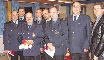 Bild: Die Geehrten mit Kreisbrandmeister Uwe Vogel (Zweiter von rechts) und Bürgermeister Klaus Schifferer (rechts). (Foto: Gustav Döttling)