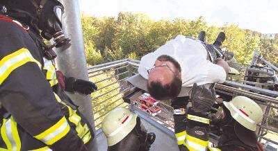 Bild 1: Mit der Trage auf der Drehleiter wird Patient Jim Knopf, gespielt von Siegfried Bogdanski aus Herrenberg, aus dem dritten Stock gerettet.Fotos: Wolfgang Müller
